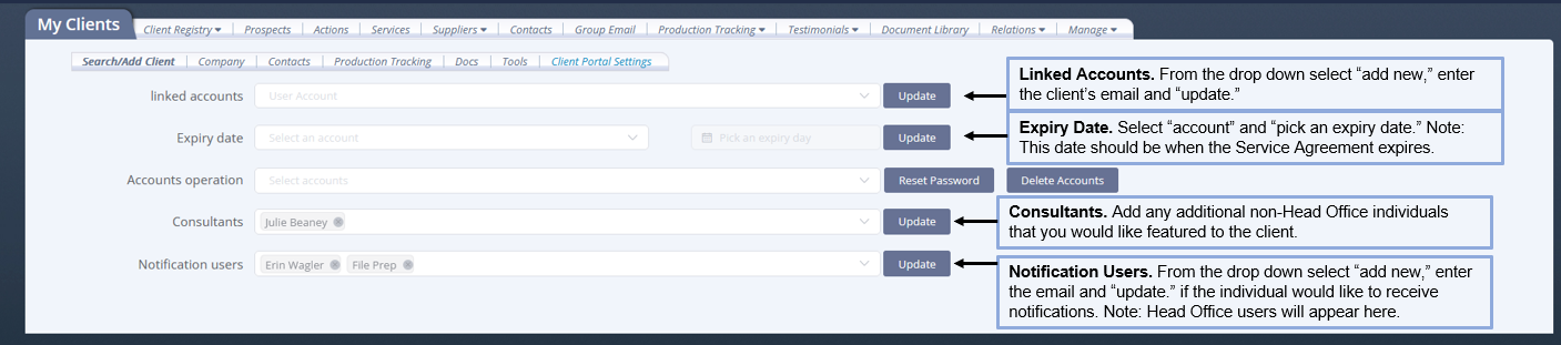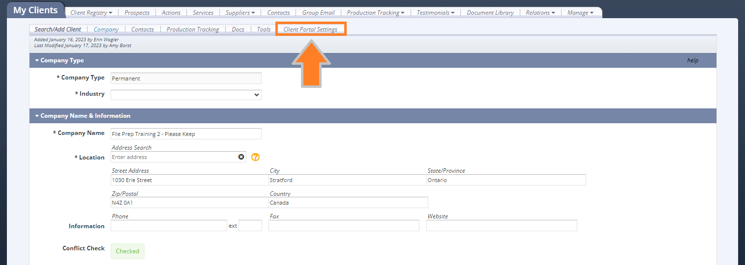 Go into the Warehouse > Select CRM > Find Client > From the Company Profile > Select Client Settings