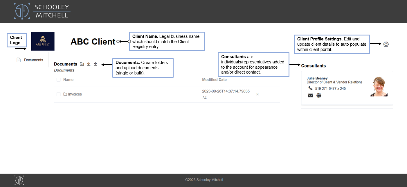 Client Logo: Added and uploaded via Client Profile Settings.